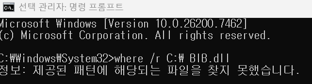 2. 관리자 권한 cmd에서 'where /r C:\ BIB.dll'를 입력해서 실행